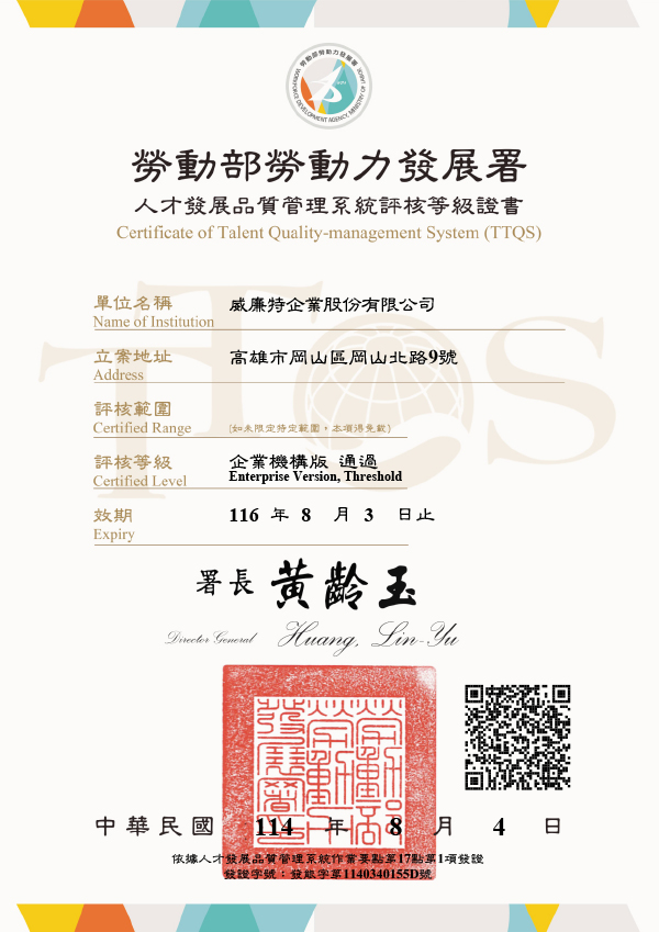In our first participation in the Ministry of Labor’s Talent Quality-management System (TTQS) evaluation, our company successfully obtained the official certification.